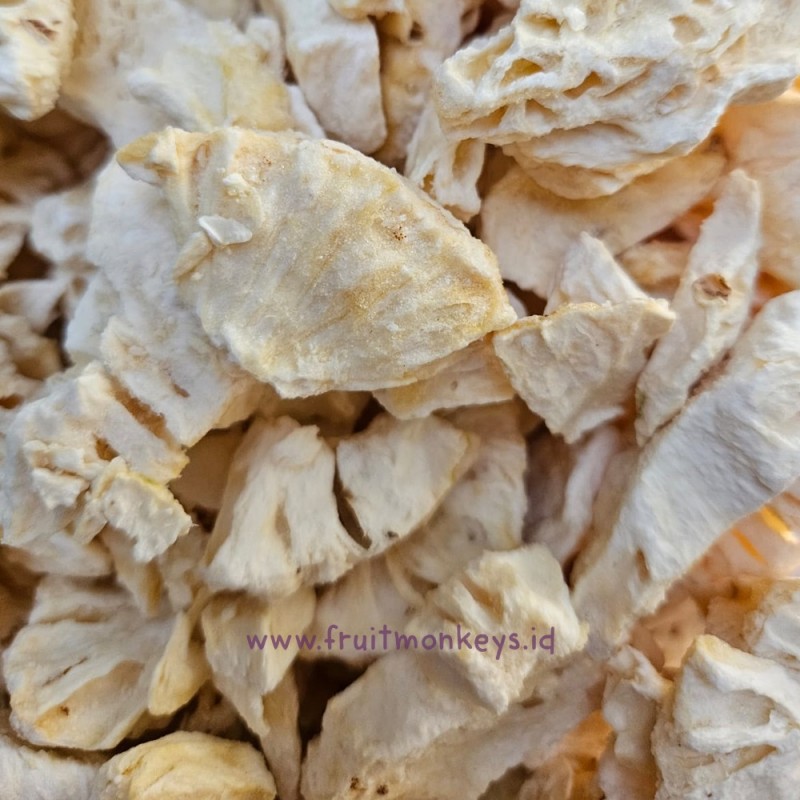 Freeze dried pineapple bukan makanan beku, tapi keripik buah yang enak untuk dicemil langsung, atau buat menemani sarapan granola, muesli, sereal, yogurt, oatmeal, salad dll. Juga bisa untuk campuran trail mix berisi kacang dan dark chocolate buat ngemil sehat kamu. Ato diblend jadi bubuk untuk smoothie/instan flavored milk, perisa dan pewarna alami untuk baking, topping dan hiasan tabor di cake, donat dll.
